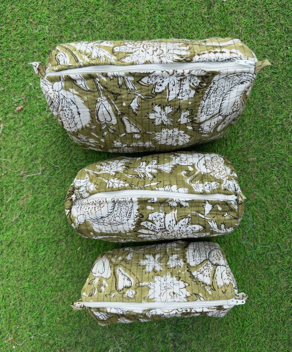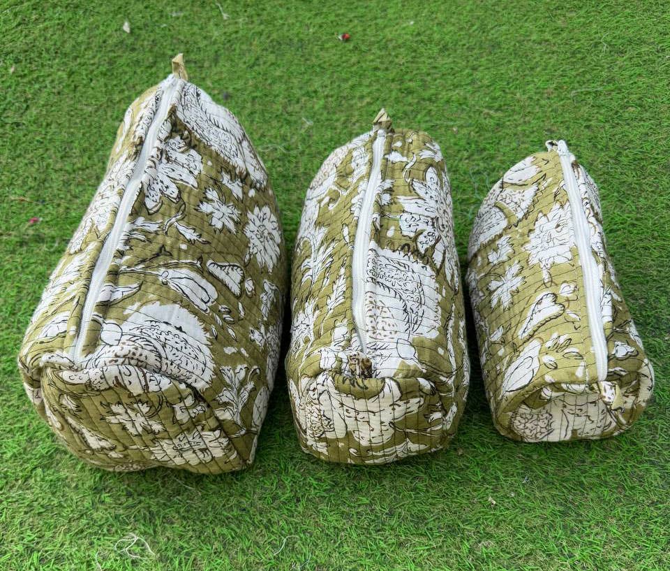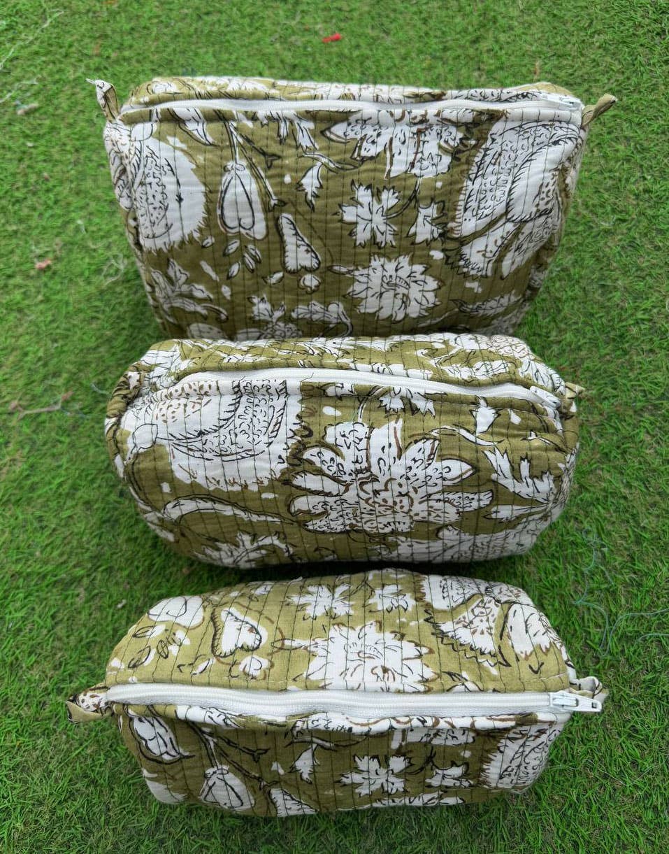 These toiletry bags are a perfect trio for your travel routine and organization. Featuring a hand-printed block print set against quilted stitching, these adorable bags are eye-catching and perfect for any on-the-go lifestyle. Grab one or purchase the whole trio of different sizes and travel in style. These bags are made by a woman-owned store that I order them from. Details: - Features a durable zipper closure to keep your items secure - Fully lined with a waterproof lining to protect against any spills or leaks Measurements: - Large : 10" (Length) x 4.7" (Width) x 5.5" (Height) - Medium: 8.3" (Length) x 3.9" (Width) x 4.3" (Height) - Small : 7.5" (Length) x 3.5" (Width) x 3.9" (Height) If you have any questions, please feel free to ask! I hope you shop with us :) Thank you!