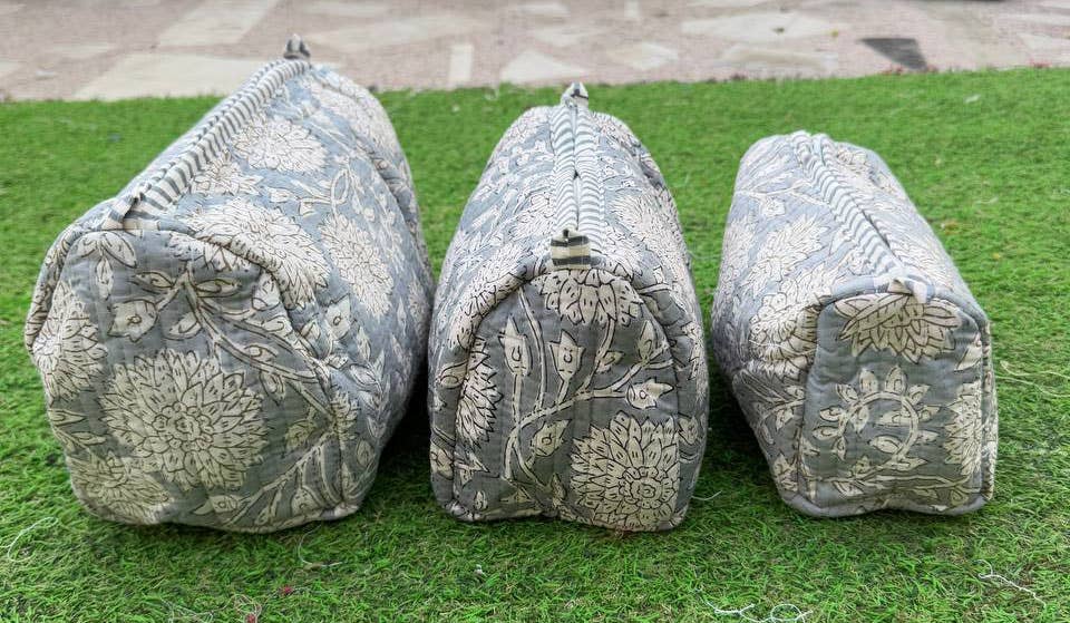 These toiletry bags are a perfect trio for your travel routine and organization. Featuring a hand-printed block print set against quilted stitching, these adorable bags are eye-catching and perfect for any on-the-go lifestyle. Grab one or purchase the whole trio of different sizes and travel in style. These bags are made by a woman-owned store that I order them from. Details: - Features a durable zipper closure to keep your items secure - Fully lined with a waterproof lining to protect against any spills or leaks Measurements: - Large : 10" (Length) x 4.7" (Width) x 5.5" (Height) - Medium: 8.3" (Length) x 3.9" (Width) x 4.3" (Height) - Small : 7.5" (Length) x 3.5" (Width) x 3.9" (Height) If you have any questions, please feel free to ask! I hope you shop with us :) Thank you!