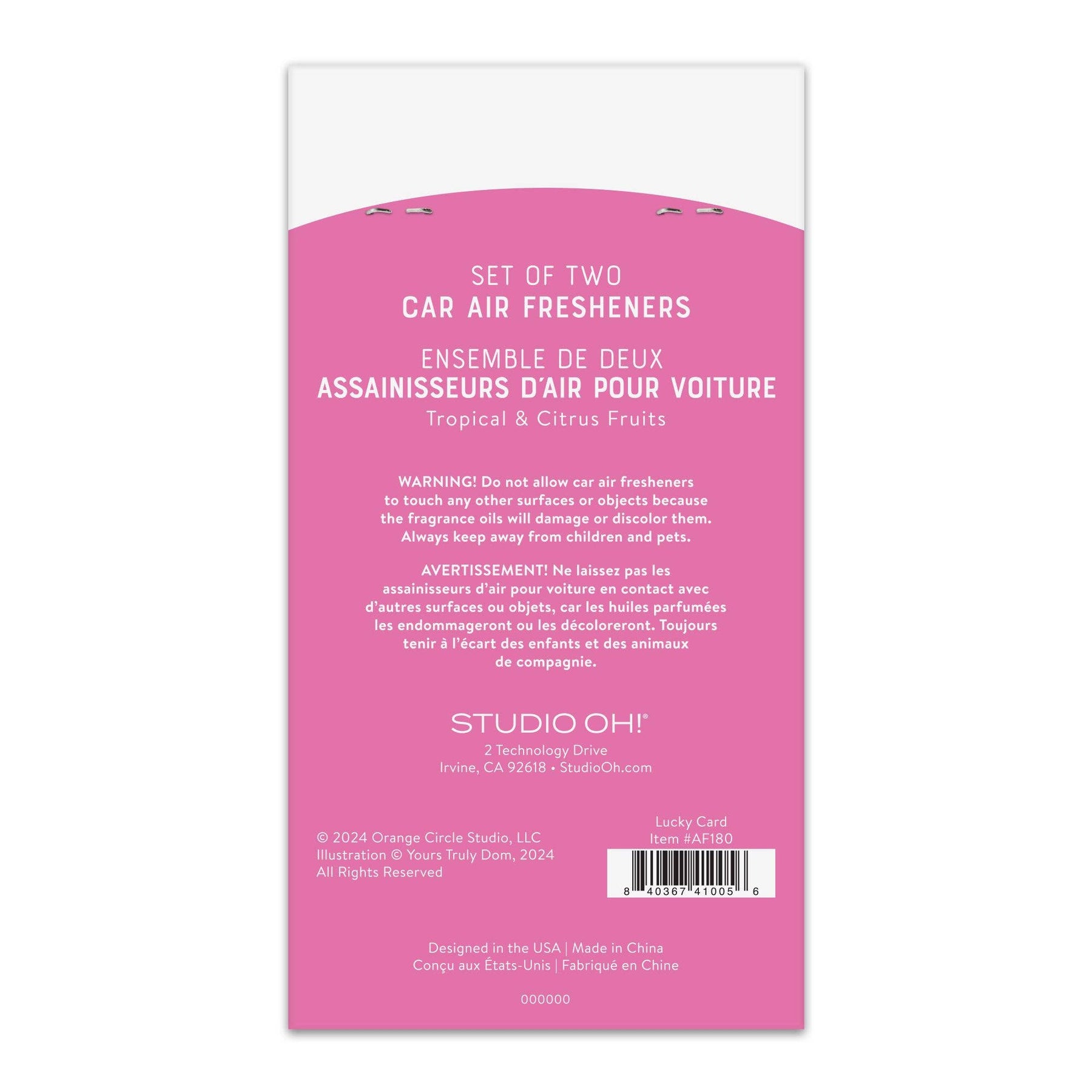 Make your drive time more pleasant with colorful car air fresheners from Studio Oh! These fragrance-infused designs are made with special DeoBoost® technology to help eliminate malodors and create longer-lasting freshness. With two car air fresheners per package, you can mix and match designs between cars or keep a spare tucked in your glove box. Set of two car air fresheners Package: 4"w × 7.5"h (10 cm × 19 cm) Features fragrances made in the USA with domestic and imported ingredients Uses DeoBoost® technology to eliminate malodors Hangs by an elastic band with a decorative wooden bead Showcases colorful artwork WARNING! Do not allow car air fresheners to touch any other surfaces or objects because the fragrance oils will damage or discolor them. Always keep away from children and pets. Fragrance: An enticing blend of tropical and citrus fruits with subtle notes of lush forest greens.