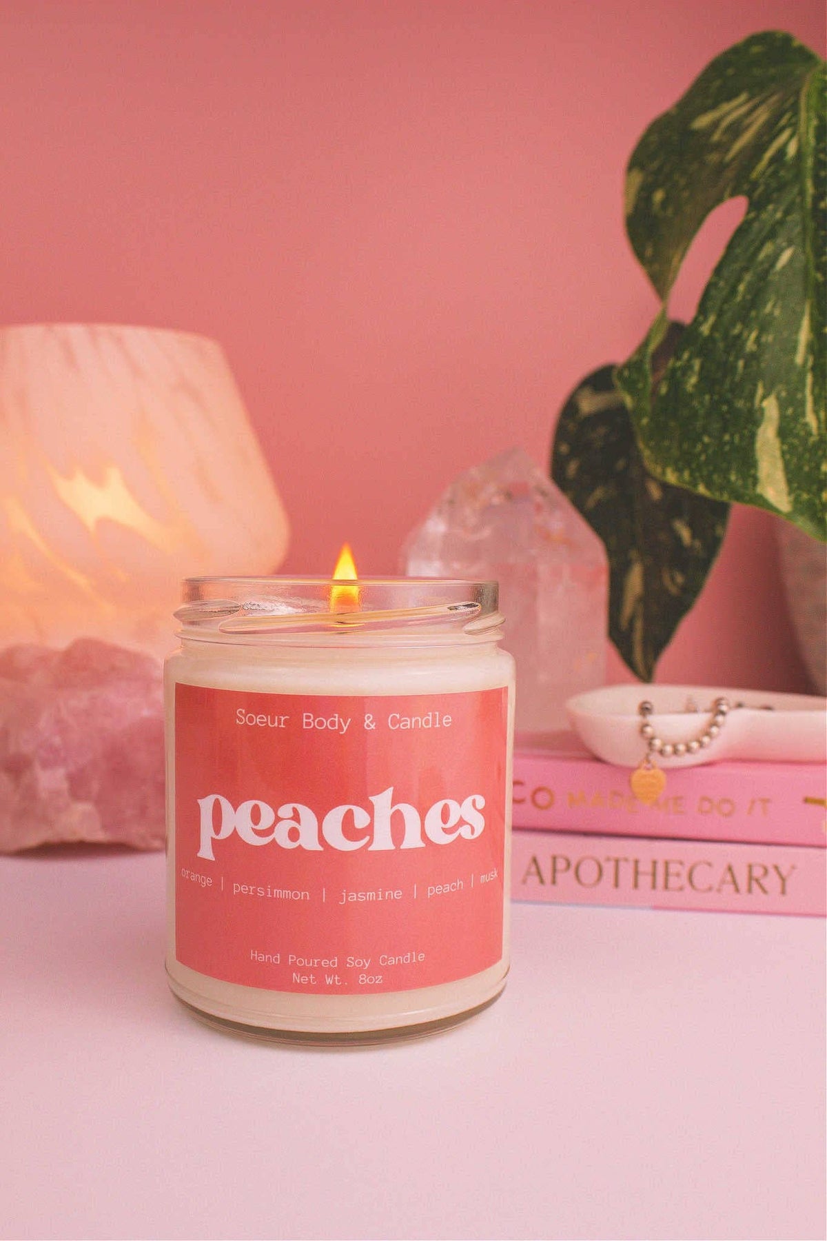 orange | persimmon | jasmine | peach | musk Candle Strength: medium Scent Type: sweet, fruity Create a relaxing atmosphere with our handcrafted soy candles. Each candle is made in small batches, featuring cotton wicks, natural soy wax, and premium fragrance oils. Enjoy a cleaner, longer-lasting burn of up to 45 hours - perfect for any space!